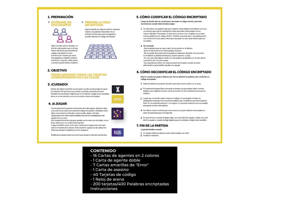Encriptado de ROYAL es un juego de estrategia. Edad: + 12 años. Contiene 16 cartas de agentes en 2 colores, 1 carta de agente doble, 7 cartas amarillas de «error», 1 carta de asesino, 40 tarjetas de código, 1 reloj de arena, 200 tarjetas/400 palabras encriptadas e instrucciones.